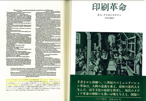 印刷革命 アイゼンステインは印刷の歴史を研究、活字文化の起原を探求し、20世紀のメディア革命の理解にも深い示唆を与えるであろう。 (原著は1983年、翻訳は1987年) コペルニクスは1974年天文学者兼印刷者レギオモンタヌスの重要論文の出版予定目録を入手し…